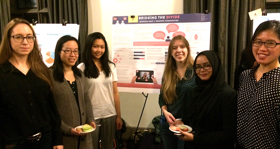 Humaira Tasnim, (pictured, second from the right) who graduated from the Information Systems Program in 2013, was on the winning team at the fall 2017 poster session at University of Toronto’s Knowledge Media Design Institute. Tasnim, along with co-authors Elena Chapman, Justina Lam, MandHumewy Poon, Claudia Szabuniewicz and Amelia Tan, won for their work titled, “Bridging the Divide Between Deaf and Hearing Communities.” The group contends that current communication methods between deaf and hearing communities are inadequate and alternative methods are needed that better meet the requirements of the deaf community.
