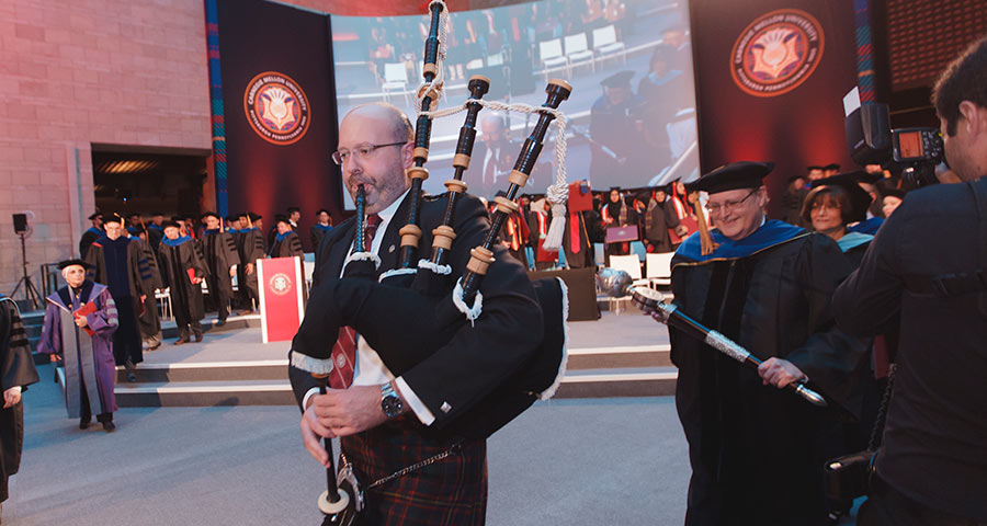 On May 1, 2017, after the graduates take their places on the stage, there will be a pause, and then the air will fill with the reedy strains of bagpipes. The piper is John Gasper, associate teaching professor of economics, and he will lead the procession of faculty members and special guests into CMU-Q’s tenth graduation ceremony.